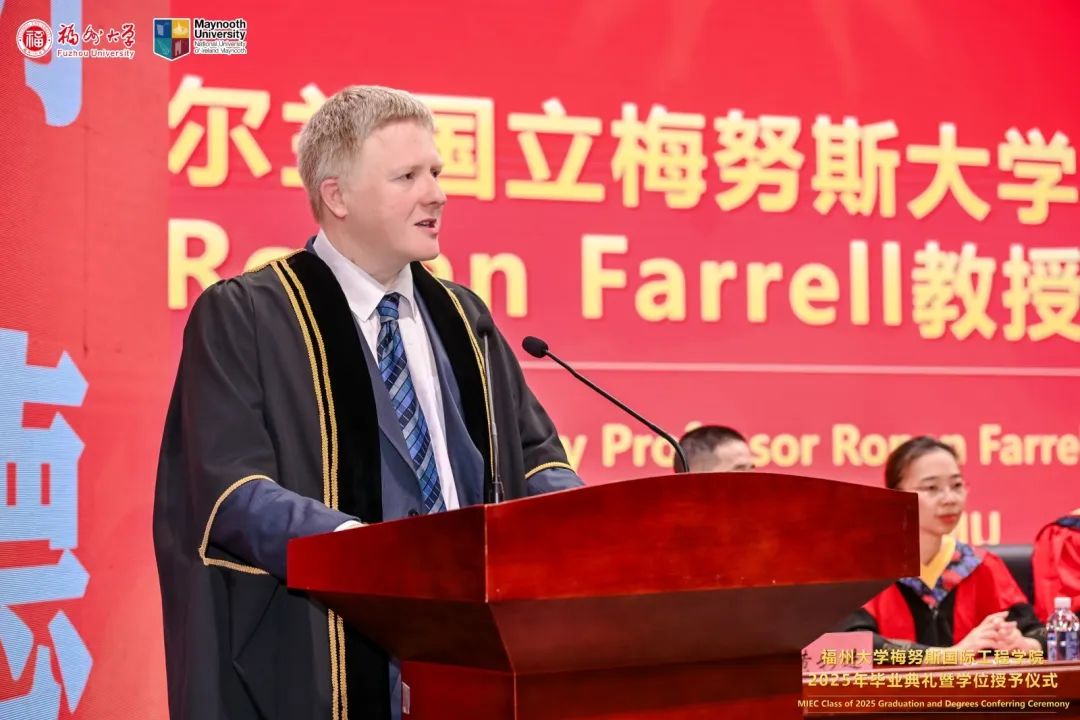 梅努斯大学副校长Ronan Farrell教授为全体毕业生送来了来自梅努斯大学的诚挚祝福。他期望同学们凭借扎实的知识储备与卓越的技能,怀揣创新思维与对卓越的执着追求,于各自选择的道路上,无畏挑战,砥砺前行,开启辉煌的人生征程。