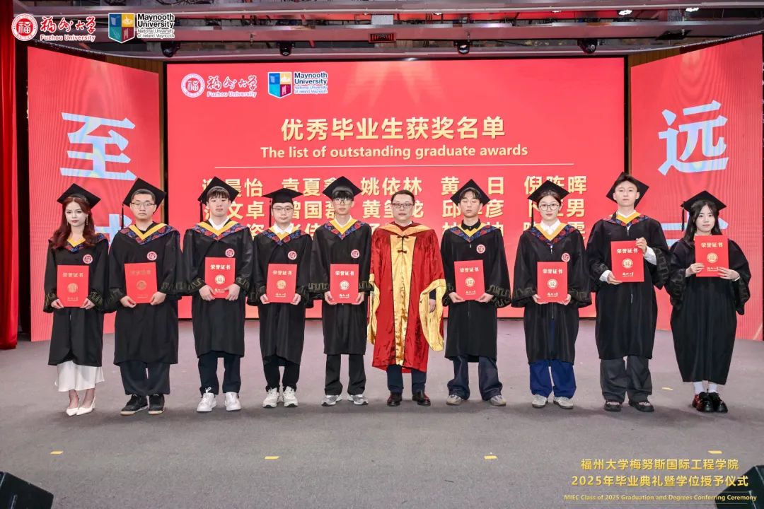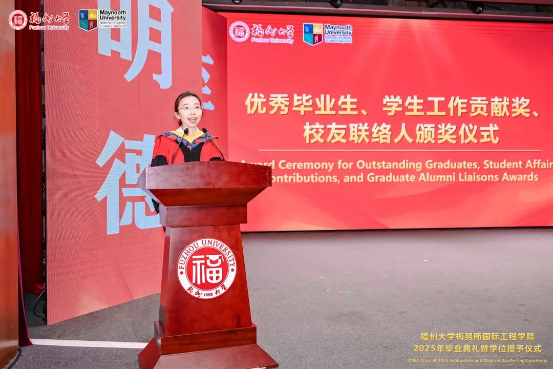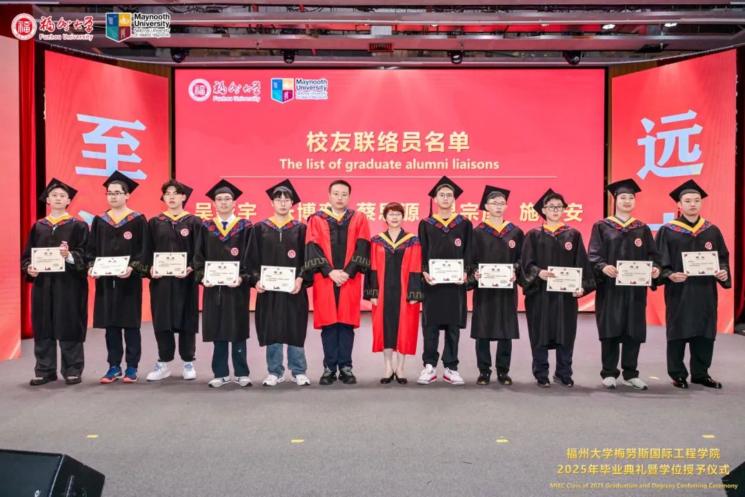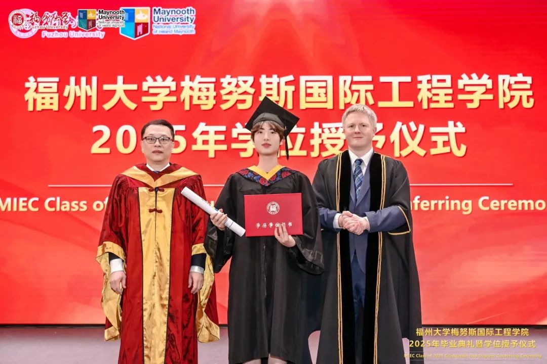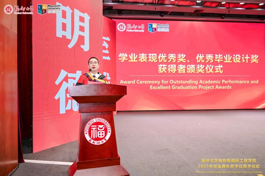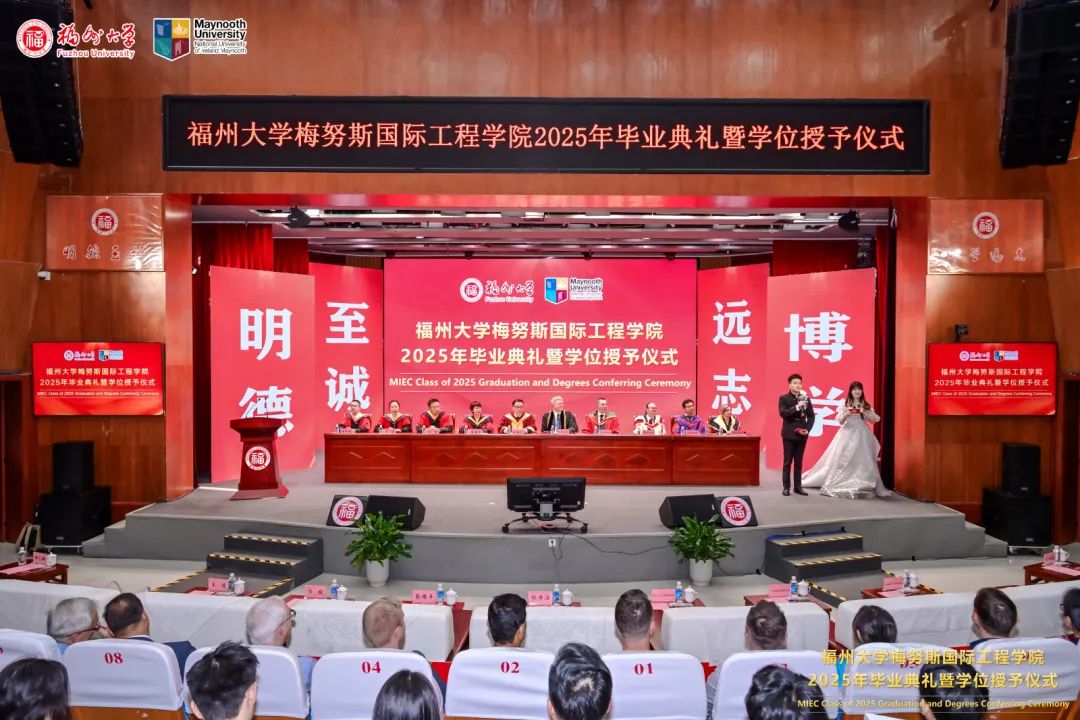 福州大学党委常委、副校长、梅努斯国际工程学院院长杨黄浩教授、学院党委翁穗平书记、常务副院长方捷教授、学院党委王涛副书记、副院长黄彩进教授出席本次典礼。爱尔兰国立梅努斯大学学术副校长、注册主任 Ronan Farrell教授、国际事务副校长Patrick McCole教授率梅努斯大学代表团,不远万里专程出席本次典礼。参加典礼的还有中外方教师、家长代表和全体2025届毕业生。典礼由学生代表杨冰旭和王慧婉双语主持。