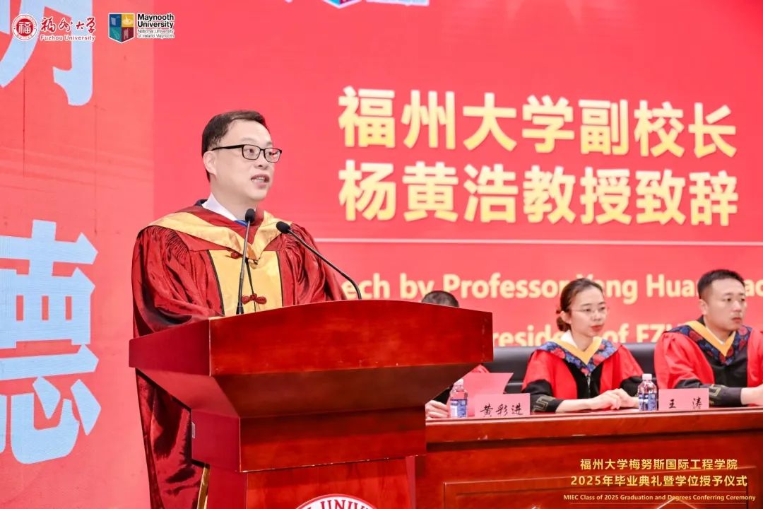 福州大学党委常委、副校长、梅努斯国际工程学院院长杨黄浩教授对毕业生们表达了诚挚的祝贺与殷切的期望。他高度赞扬了同学们在大学期间为学院和学校发展所做出的积极贡献,并对同学们顺利完成学业表示热烈的祝贺。