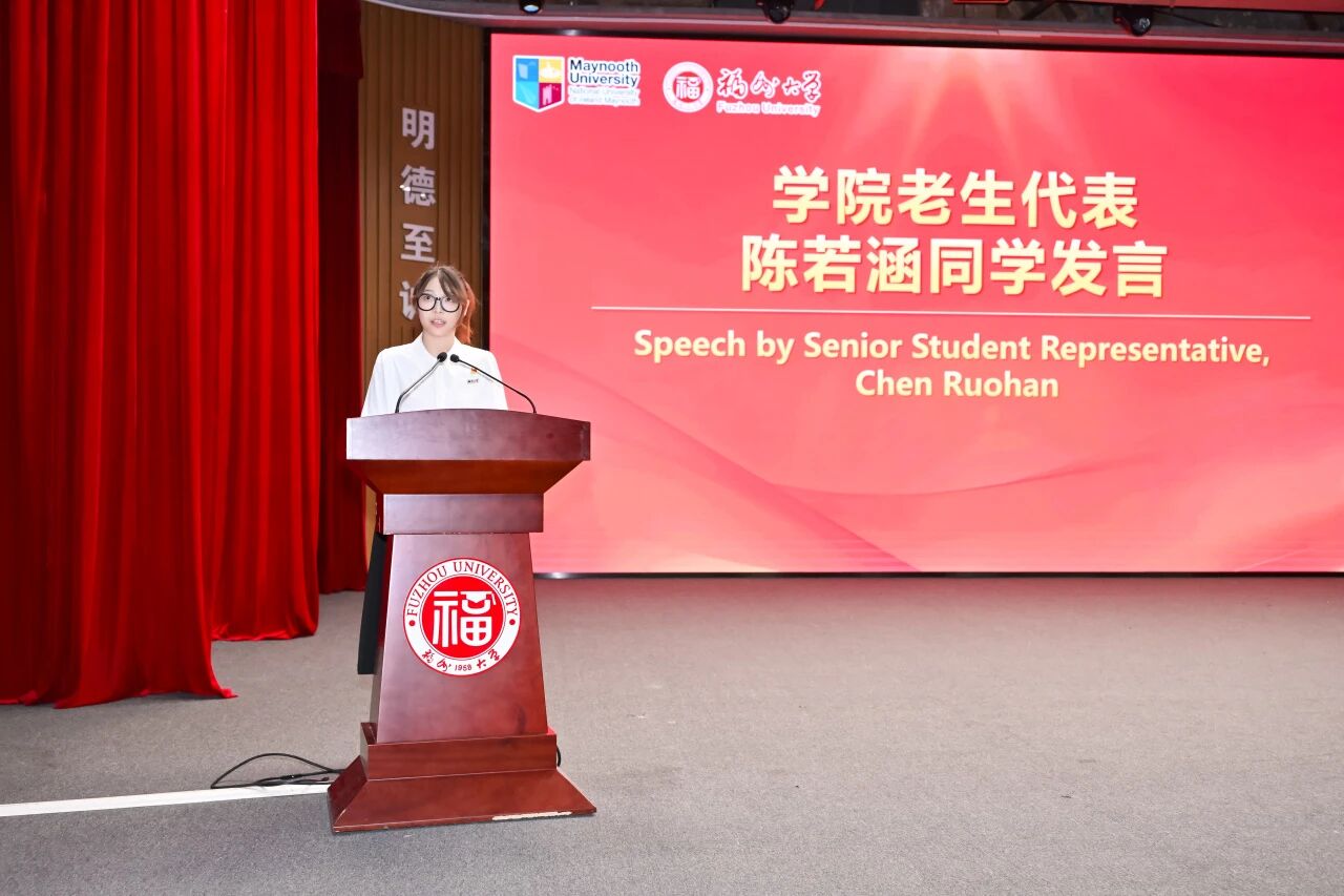 2023级数字媒体技术专业的陈若涵同学作为学院老生代表,向全体新生致以热烈欢迎。她分享了自己入学以来与福大梅努斯相伴成长的点滴故事,以亲身经历鼓励新生:坦然接纳成长路上的挫折与挑战,大胆尝试未知可能,以永不懈怠的追求与奋斗姿态,扛起新时代中国青年的责任与使命。