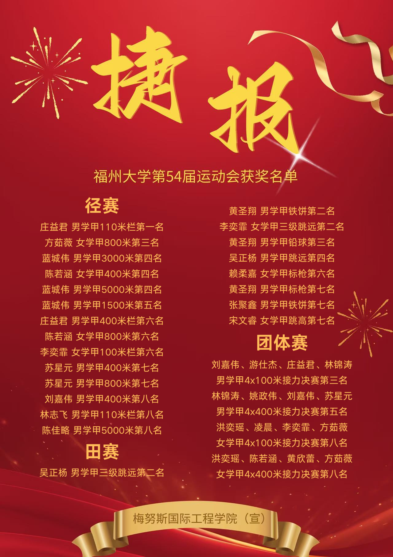 驰骋在梦想的赛道上,岁月镌刻追光者的足迹。胸前的勋章,是对奋斗最有力的见证。2025年11月15日,福州大学第54届校运会圆满落幕。在本届校运会中,我院师生凝心聚力,并肩向前,以热血与汗水续写了青春的昂扬诗篇,为学院的荣光再添浓墨重彩的一笔。